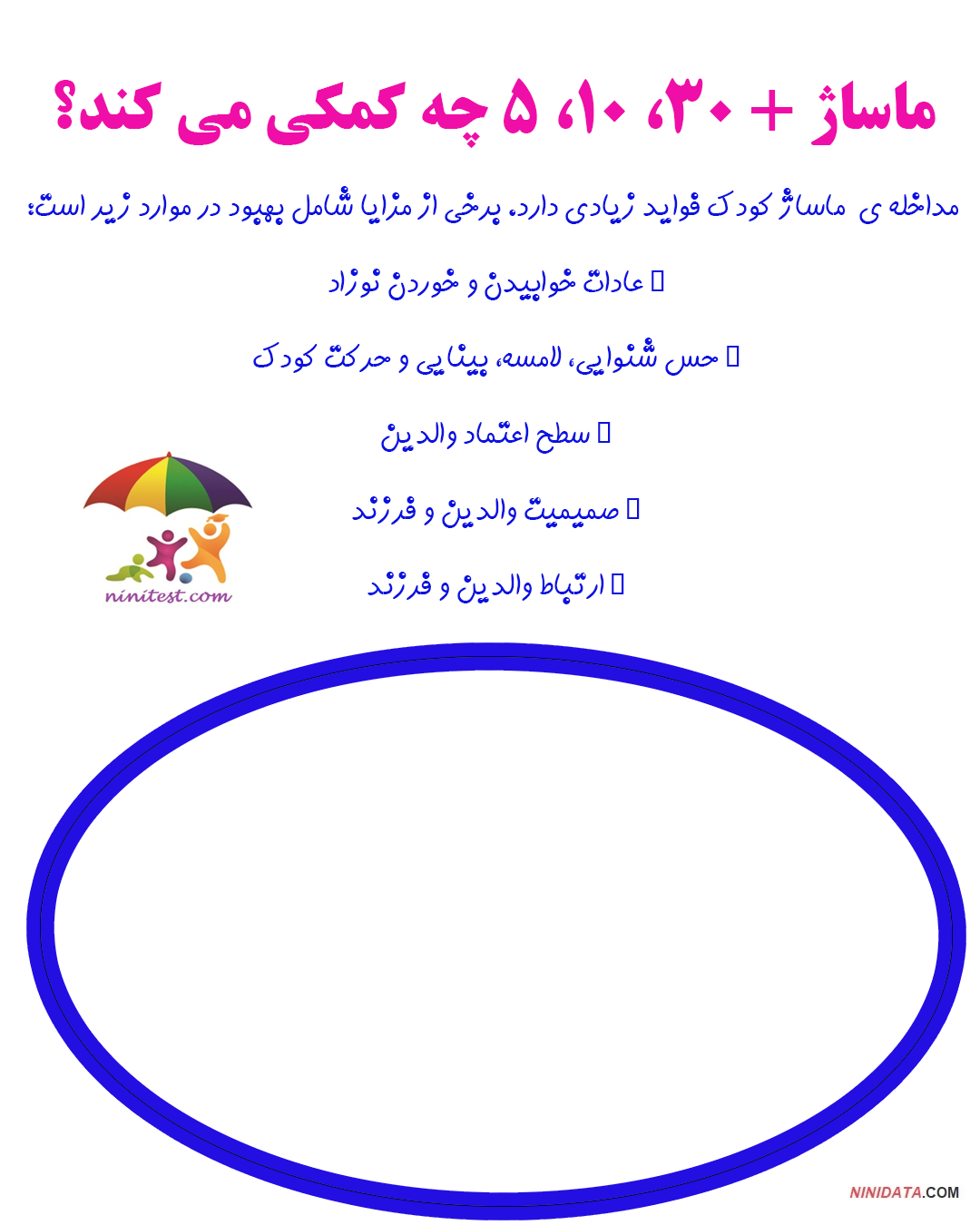 ماساژ + 30، 10، 5 یک مداخله ساده، سریع و قدرتمند با استفاده از ماساژ برای کمک به بهبود سلامت وتکامل نوزادان نارس و ترم است. ماساژ شامل ماساژ سر، بازوها، پاها، شکم و پشت کودک است و همچنین همراه با ارتباط و حرکت است در این مقاله به این موضوع پرداخته ایم